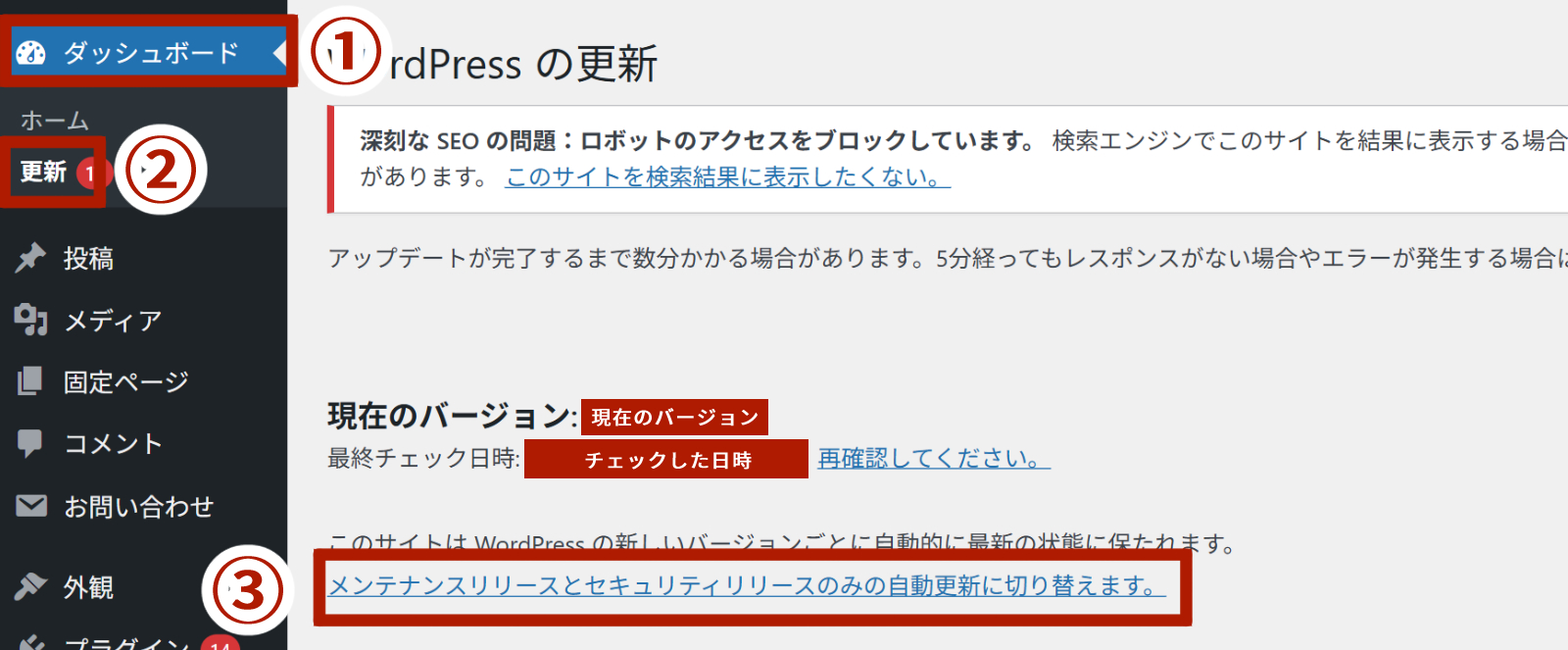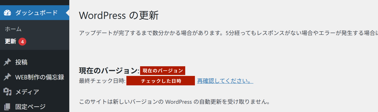 「このサイトは新しいバージョンのWordPressの自動更新を受け取りません。」