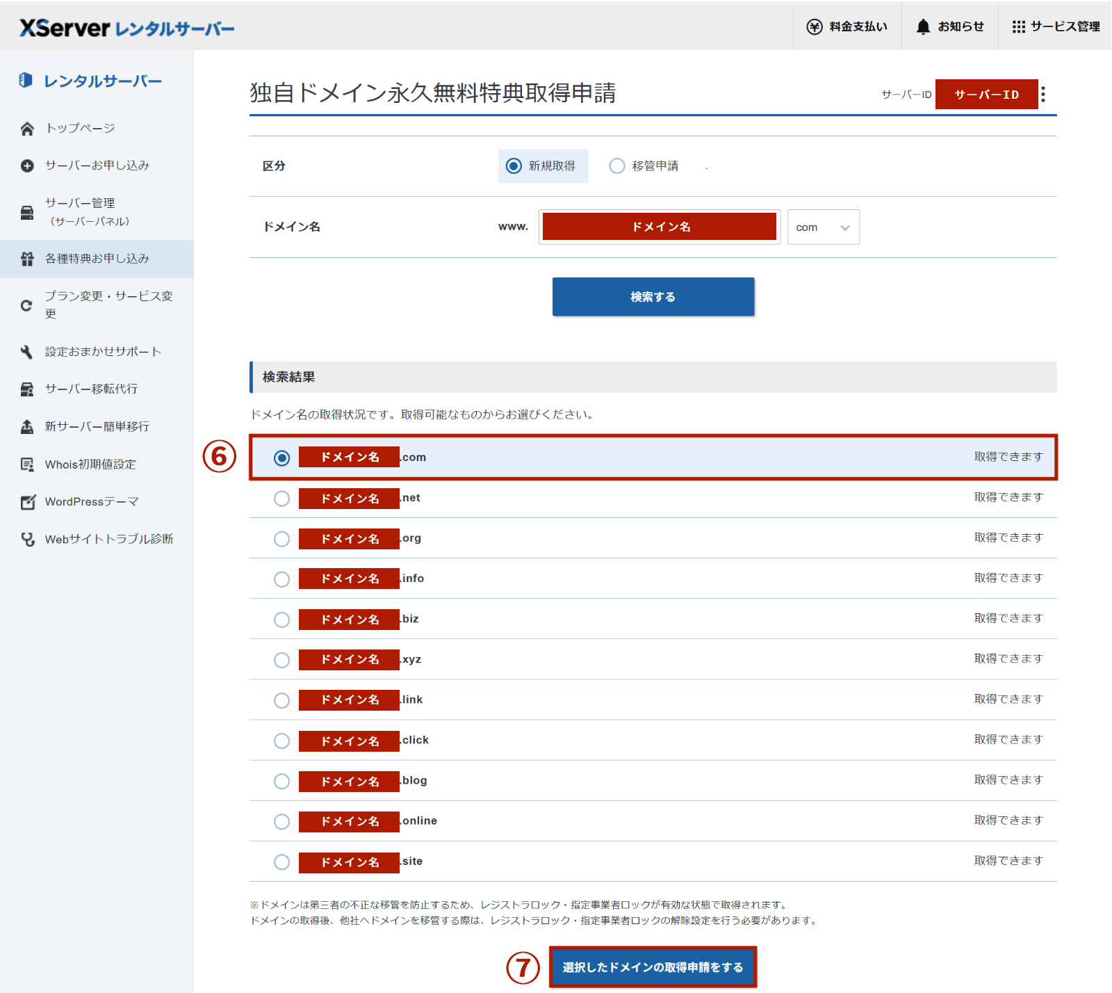 ⑥ドメインを選択して、⑦「選択したドメインの取得申請をする」をクリックします。