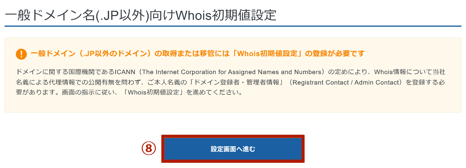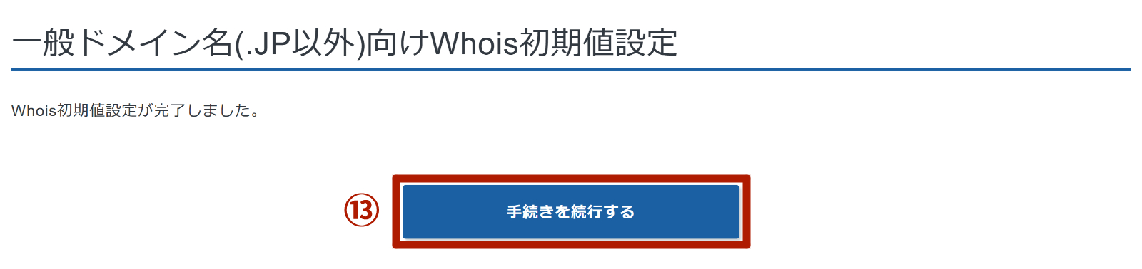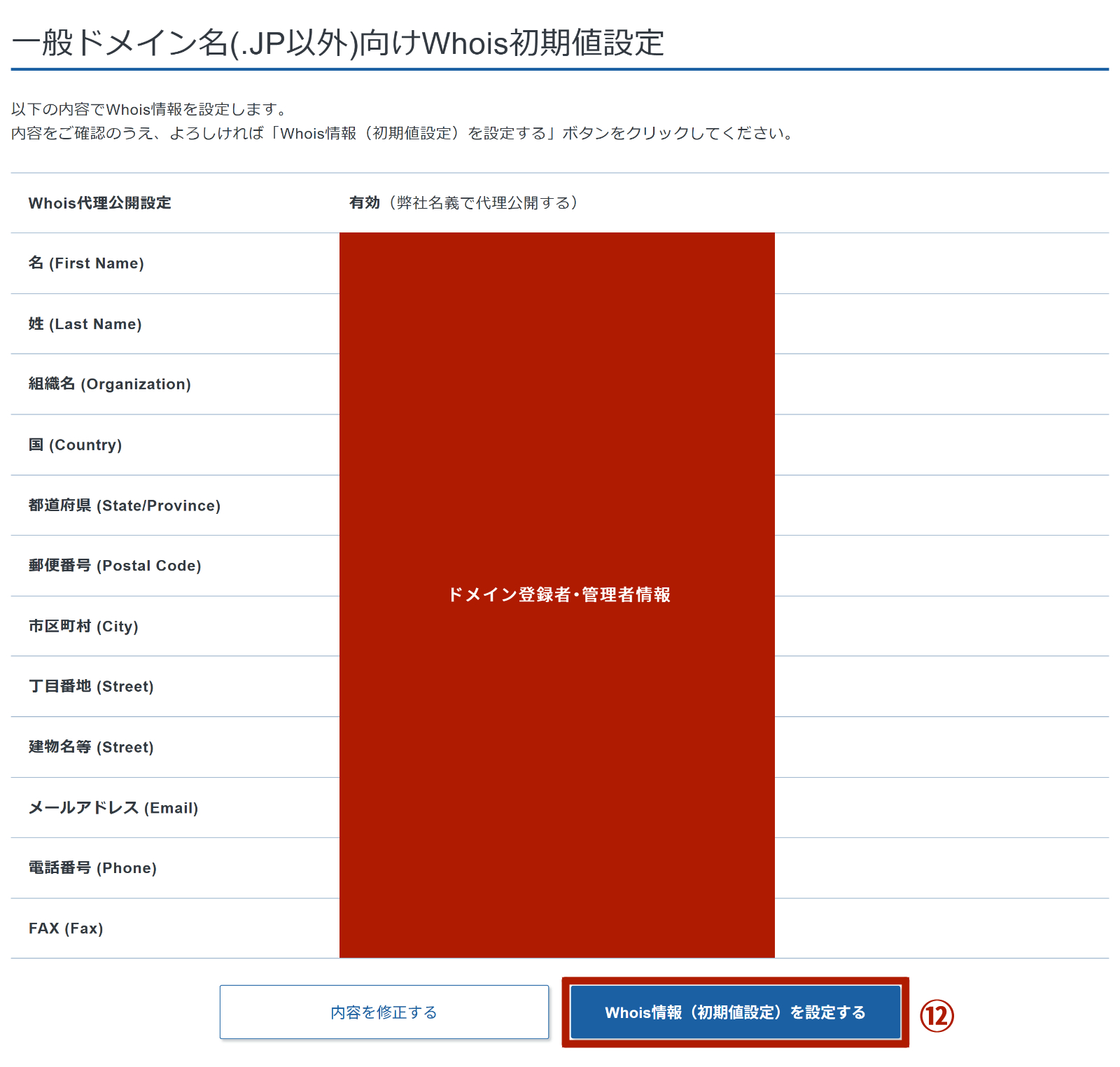 内容に問題がなければ、⑫「Whois情報(初期値設定)を設定する」をクリックします。
