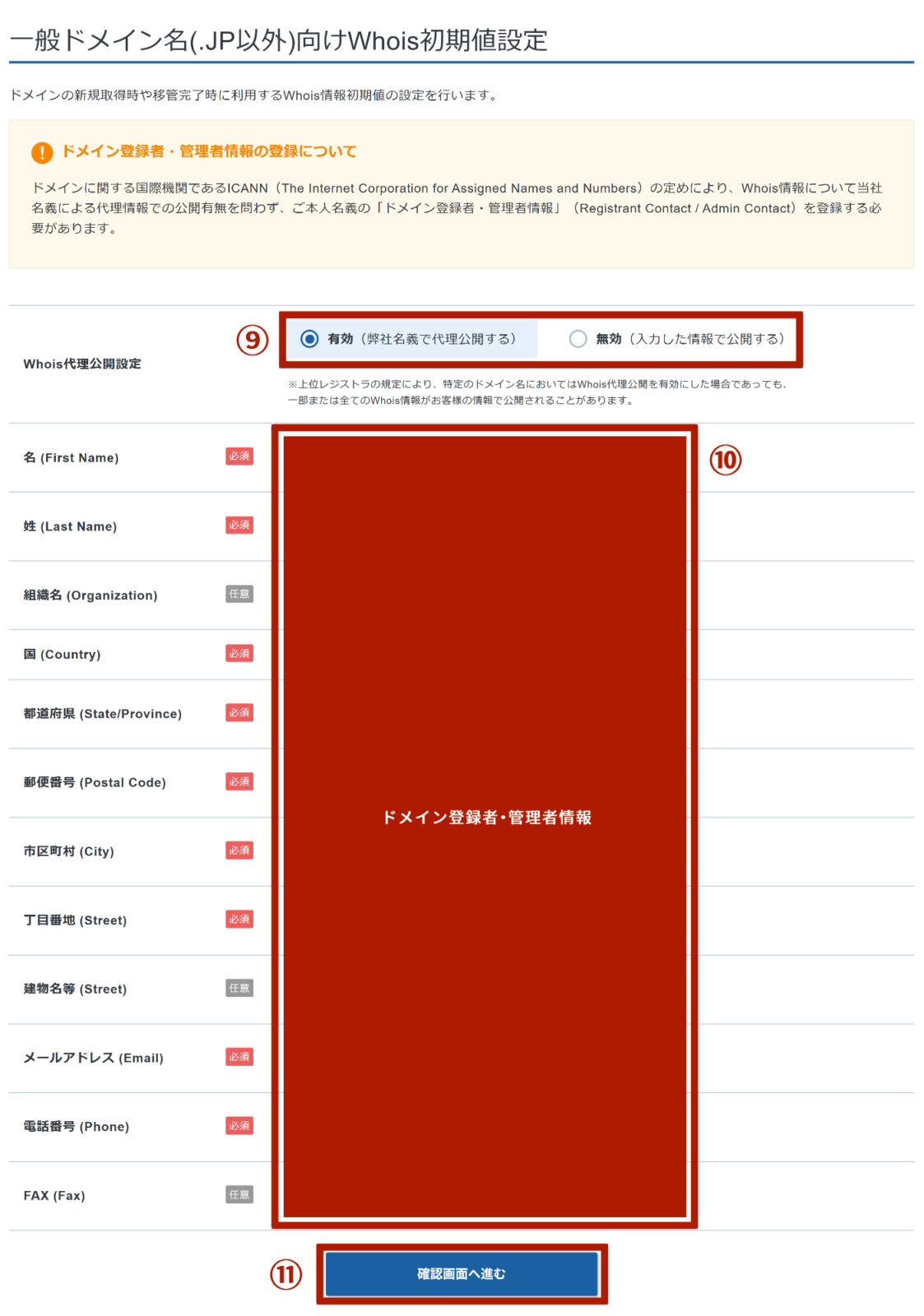 自分の個人情報が表示されたくない場合は、⑨「Whois代理公開設定」を有効にしましょう。