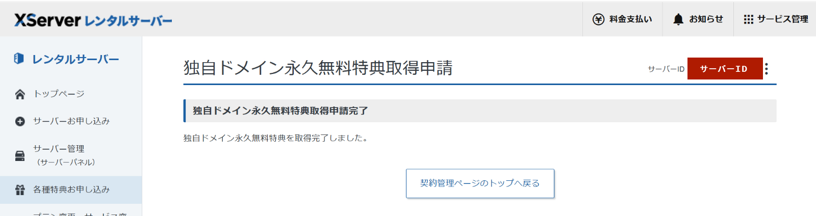 「独自ドメイン永久無料特典を取得完了しました。」と表示されます。