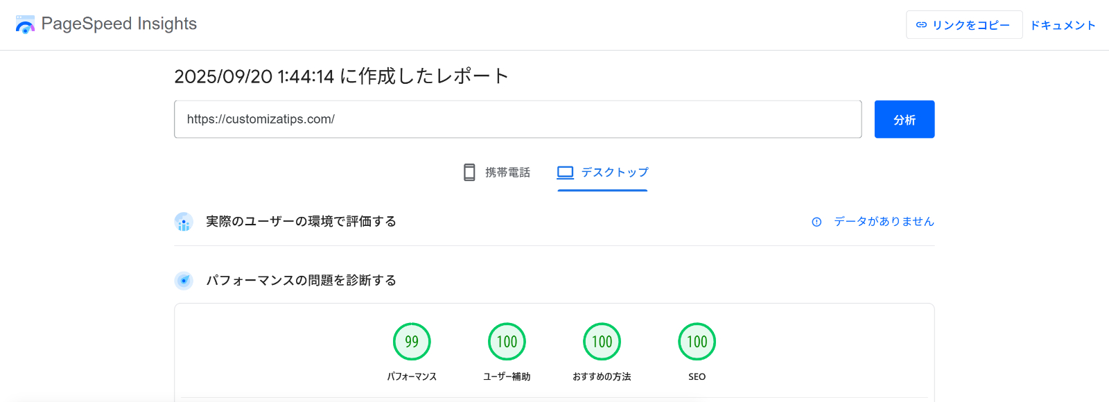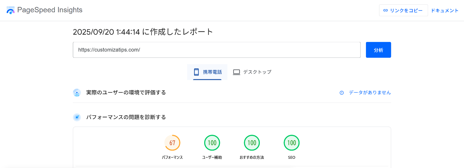 PageSpeed Insightsという表示速度などの評価をしてくれるツールがあります。そちらでWEB customization TIPSを調べてみました。
